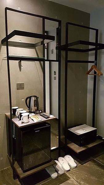 旅店以黑色為主調,增添了許多神秘感,而這神秘感讓晚上的Bar更加迷人,大廳上方的鏡面設計更讓整體空間有擴大感。辦理完入住手續,會由管家帶領進房,介紹房間、公共設施,亦順道再了解行程規劃。帶領的管家很棒,熱情適中,很像跟朋友聊天一樣。(請原諒我忘了名字,那位短髮、可愛的女管家,讓人印象深刻)房門一開,最先吸引我的便是右邊這兩個俐落的置衣架。簡潔的泥牆搭配類工業風格,是最讓我難以抵擋的。冰箱裡的水及可樂,均是免費享用的。