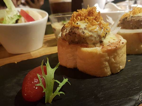餐點分量並不小,所選的班尼豬肉堡,就有沙拉、優格、湯品、醃製番茄及主食,另含有一杯飲品可選咖啡或紅茶。口味不錯,雖都是常見的食材,卻很有創意,有意想不到的食感。吃完整個飽上天,原定中餐要去享用的餐廳都臨時取消,改成散步消食。