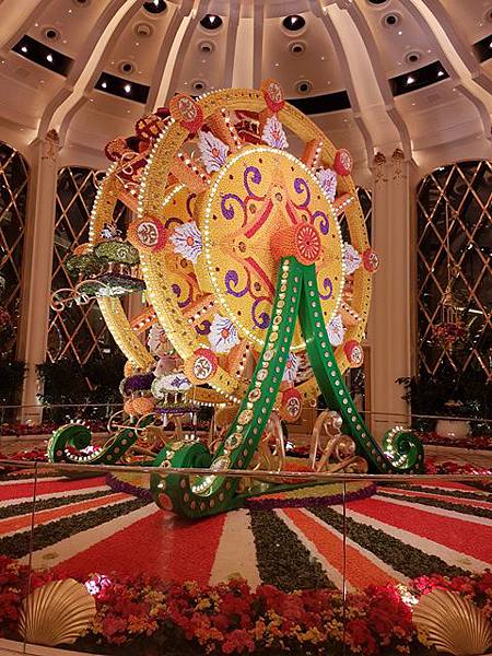 澳門酒店最大的共通點就是大且容易迷路,而永利皇宮也承襲了一貫的共點,若沒有隨處可見的工作人員或指標,還真讓人頭痛。若不想在酒店裡迷路,除了搞清楚自己待的位置位在的方位,最好還是要有一張酒店地圖最為保險。另外,因為永利皇宮的賭場設置的位置比較特別,若要快速的穿梭各處,穿越賭場通常是最快的路徑,可別忘了將護照隨身攜帶,以防賭場出入口要查驗年齡。搭乘免費的接駁車(接駁車時刻表請點我)至南門入口下車,穿過門便是大廳,首先迎接你的是濃烈的香氣,香氣來源是那大量採用鮮花的造景。圖中所見的摩天輪及下方的地毯,全都是由一朵朵的花堆出來的,不僅吸睛還很好聞。服務員告訴我們,這些鮮花每過一陣子就會換過一批,真的很用心阿!
