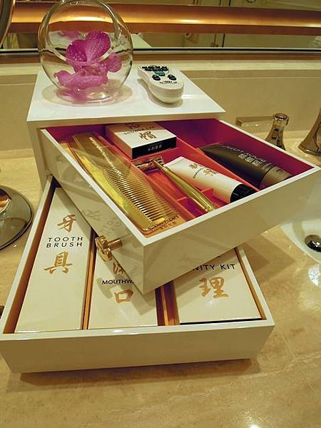 浴室的空間配置意外的沒把浴缸凸顯出來,反而把它擠進最角落的位置。將身體沖洗乾淨,走出來轉個彎就可以直接泡澡。發現了嗎?就連房內也不乏鮮花點綴,搞得我心花怒放。這間房雖然很多細節處做得很好,可配色上採用了大量的金色,雖然貴氣也略感俗氣。當我們看見金黃閃閃的梳子、刮鬍刀甚至牙刷的時候,嘴角不禁失守。幾乎你需要的用品這裡都提供齊全了,連少見的漱口水、修整指甲的護理組都有。而沐浴用品採用的是英國的品牌,這個牌子在台灣並不常見,最讓人愛不釋手的是身體乳液,不僅好推,香氣也很高雅怡人。