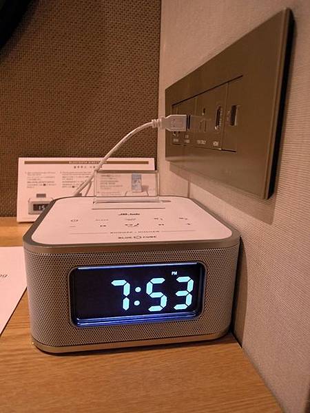 房間的插頭採用的是萬國插頭及USB,雖然配置的插頭數量並不算多,但還算夠用,對於旅人來說是很便利的配置。這台白色的音箱,也成為了每天早上化妝時的良伴,音質還算不差,重點是顯示的標準時間可以提醒著我們韓國有時差。