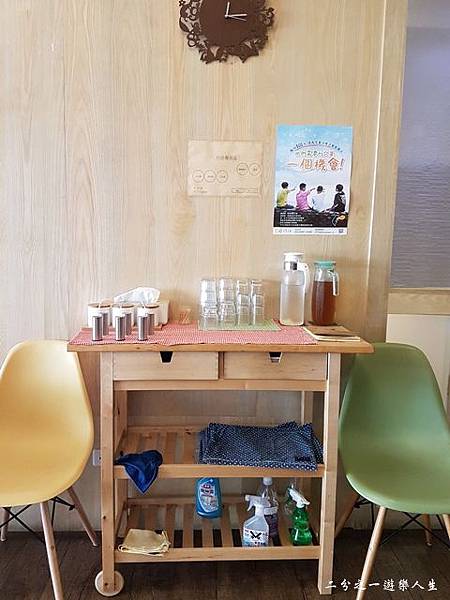 調味料、水杯及茶均為自取,那散落的清潔用品若能用個籃子整理一起,或許不會讓人感到那麼雜亂。桌布旁放了條抹布,即便是乾淨的,看起來都沒那麼潔淨了,可惜了這張好看的櫃子。