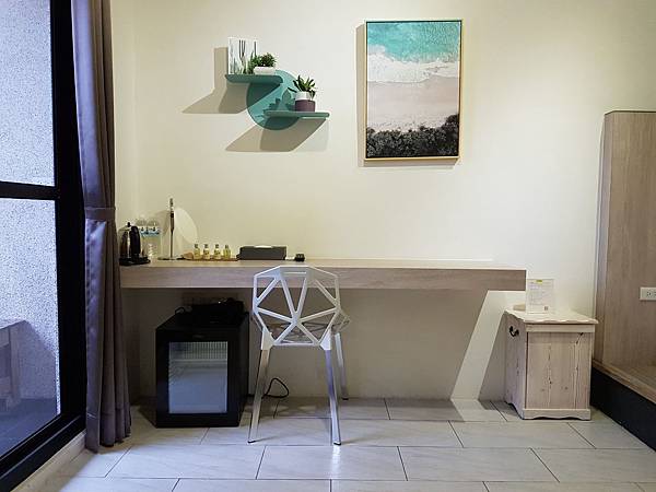 由於廁所可以擺放東西的檯面並不多,因此所有的備品除了毛巾之外都擺放在書桌檯上,這點雖有些小小不便,但反正只是短住幾天,倒也無妨。那張頗有設計感的椅子,好看卻不好坐,很吃屁股肉,沒一會已經坐不住。