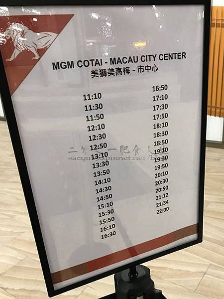 從澳門機場搭乘接駁車抵美獅美高梅約5分鐘而已,美獅美高梅的接駁車非常顯眼好認,遠遠的只要看見橘色的接駁車,就是美獅美高梅的,絕不會認錯。很喜歡接駁巴士的站牌設計,黑金色的配色,顯得落落大方又高貴,讓人會想多看幾眼。寄放完行李,立馬搭上往澳門市中心的接駁車,準備開始澳門半島的行程。