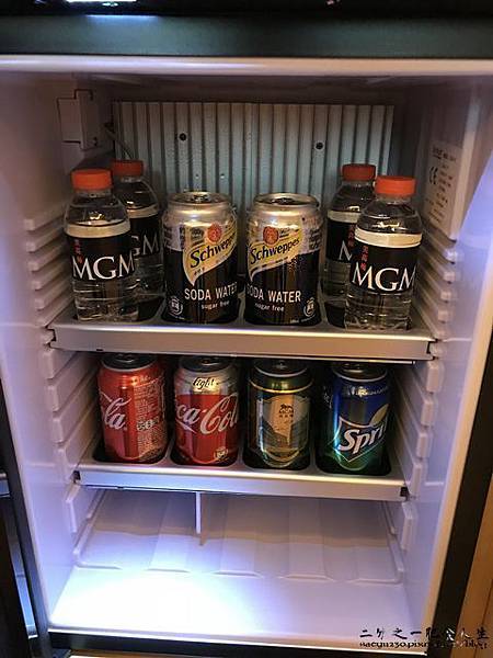 冰箱裡的飲料全部免費,想喝就盡量喝,完全不用擔心。雖然水很小瓶,幾口的功夫就見底,但幸好準備的瓶數還算多,即便沒有夜床服務可以補充,卻還算夠喝。(普通的清潔都來不及了,怎麼可能有人力開夜床呢)
