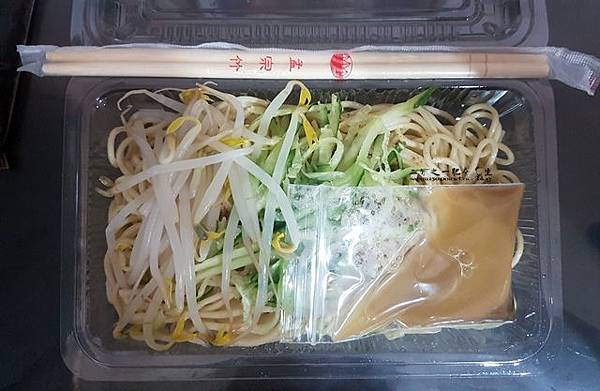 因為是沒吃過的店家,為了怕踩雷,只買了小份的來嚐。小份的招牌涼麵要價40元,盒子的大小大概跟早餐店裝壽司的塑膠盒一樣大而已,感覺是吃巧的類型。醬包共有兩包,分別是麻醬包跟醬料包,分法跟便利商店的一樣。享用前認真的先將麻醬包揉勻再倒出,接著再豪邁的將醬料包一口氣全倒出,最後再認真的拌勻,用餐的前置作業也就完成了。