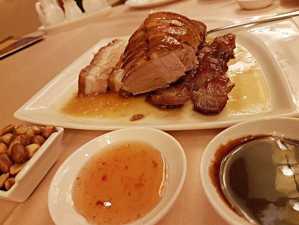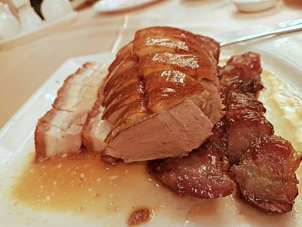 雖是平日,餐廳裡還是有不少桌用餐的客人。幸好,還是有一桌被柱子擋住能從兩旁大片玻璃看見摩天輪夜間美麗的座位。翻了翻菜單,人人都說好的烤鴨自然要點,只是只有兩個人用餐,點一整隻並不明智,拼盤就成了首選。拼盤的內容可以自己任意搭配,彈性頗高。這次點了燒肉、烤鴨及叉燒的組合(560元),是我在香港最愛吃的幾樣燒味。只可惜烤鴨肉太柴,如果不沾醬,真的很不好下嚥。叉燒醬汁不夠濃厚,肉質也略偏硬,可惜了些。三樣裡頭稍微比較正常的燒肉,皮的脆度有呈現出來,肥肉的部分處理的也很恰當,讓人欣慰了些。